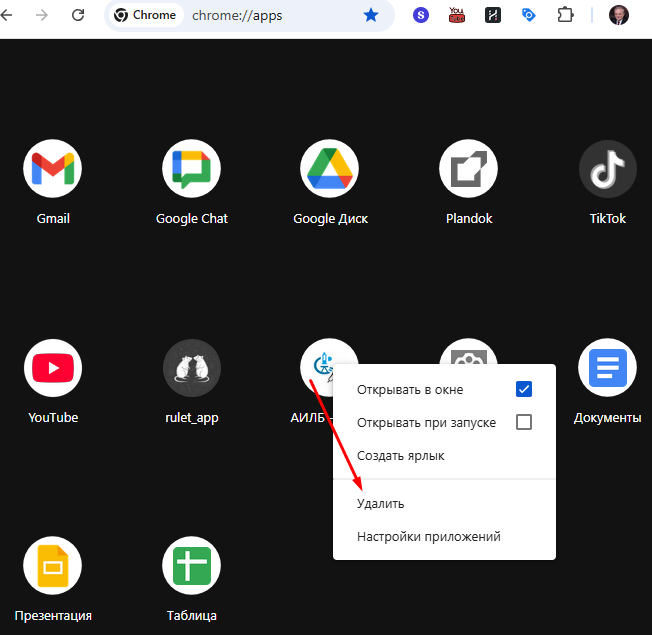 Для удаления приложения в Chrome на Windows используйте ссылку chrome://apps/: